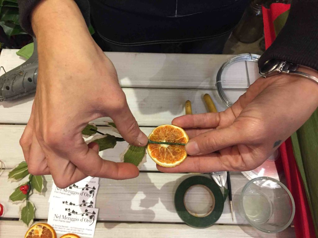 Per finire l’agrifoglio in carta crespa si decora con la fetta di arancia stabilizzata