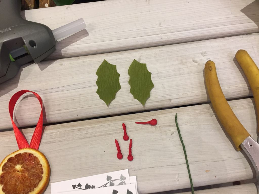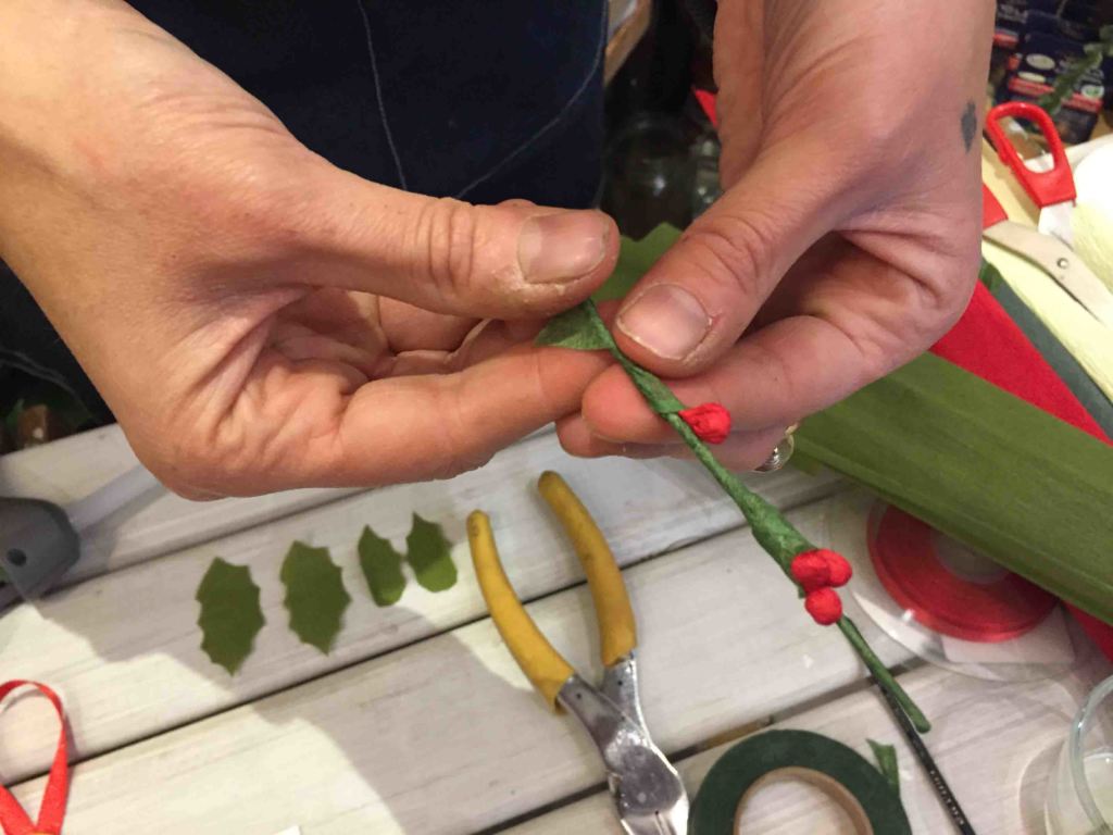 Foglie e palline per l’agrifoglio prima di essere inserite sul rametto