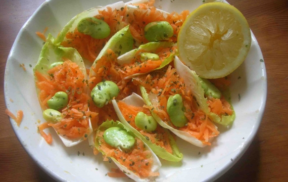Una deliziosa insalatina di fine primavera di Ma Vi Cucina Ecozoica che omaggia così i colori dell’estate Un?insalatina di fine primavera di Ma Vi Cucina Ecozoica. Sfogliare il cespo di indivia, scegliere alcune foglie, lavarle bene e disporle su un piatto. Spazzolare una carota (se bio) oppure raschiarla un po? con un coltello, sciacquare e grattugiare grossolanamente. Spremere subito alcune gocce di limone per evitare l?annerimento. Sgranare un paio di baccelli di fava e togliere la pellicina esterna. Riempire le