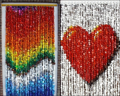 La procedura è molto simile alla creazione del lampadario con i tappi di plastica (vedi sopra), ma anziché unire i tappi di plastica ad una forma circolare di cartone, sistemate le file della tenda verticalmente su una lunga cornice di legno, in modo orizzontale, così da attaccarla al muro con qualche chiodo.